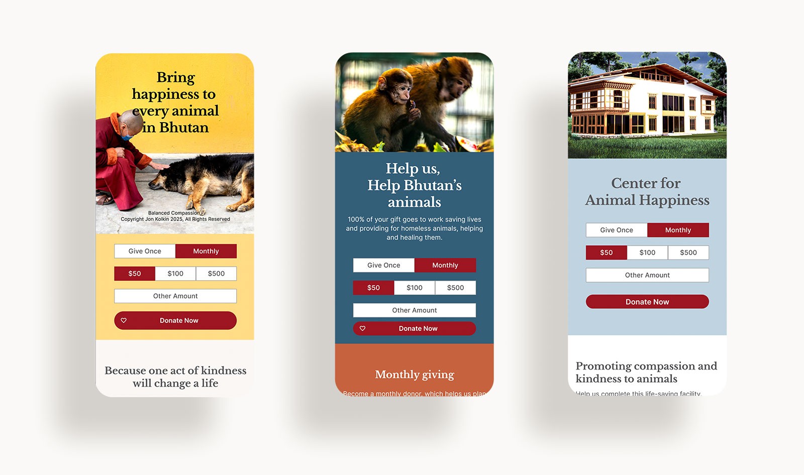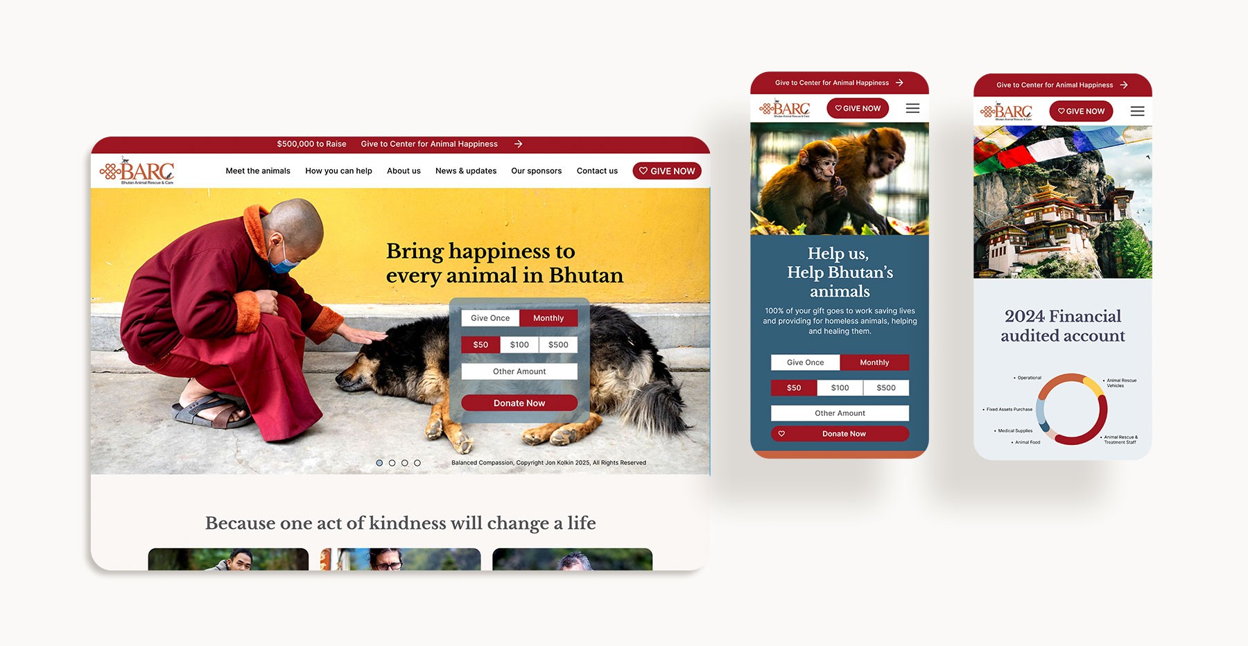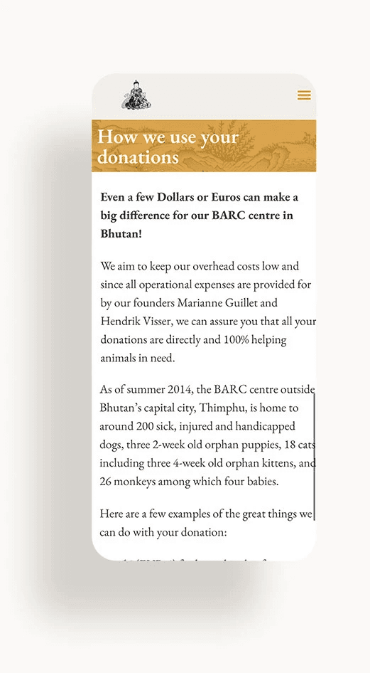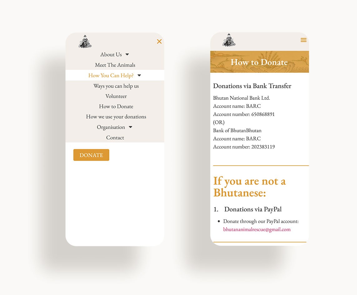 BARC is a nonprofit dedicated to animal rescue and care in Bhutan. I designed a website to connect international travelers with their mission, transforming the compassion visitors feel for Bhutan into meaningful support for local animal welfare.