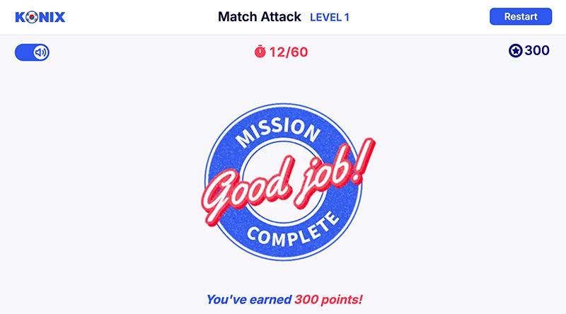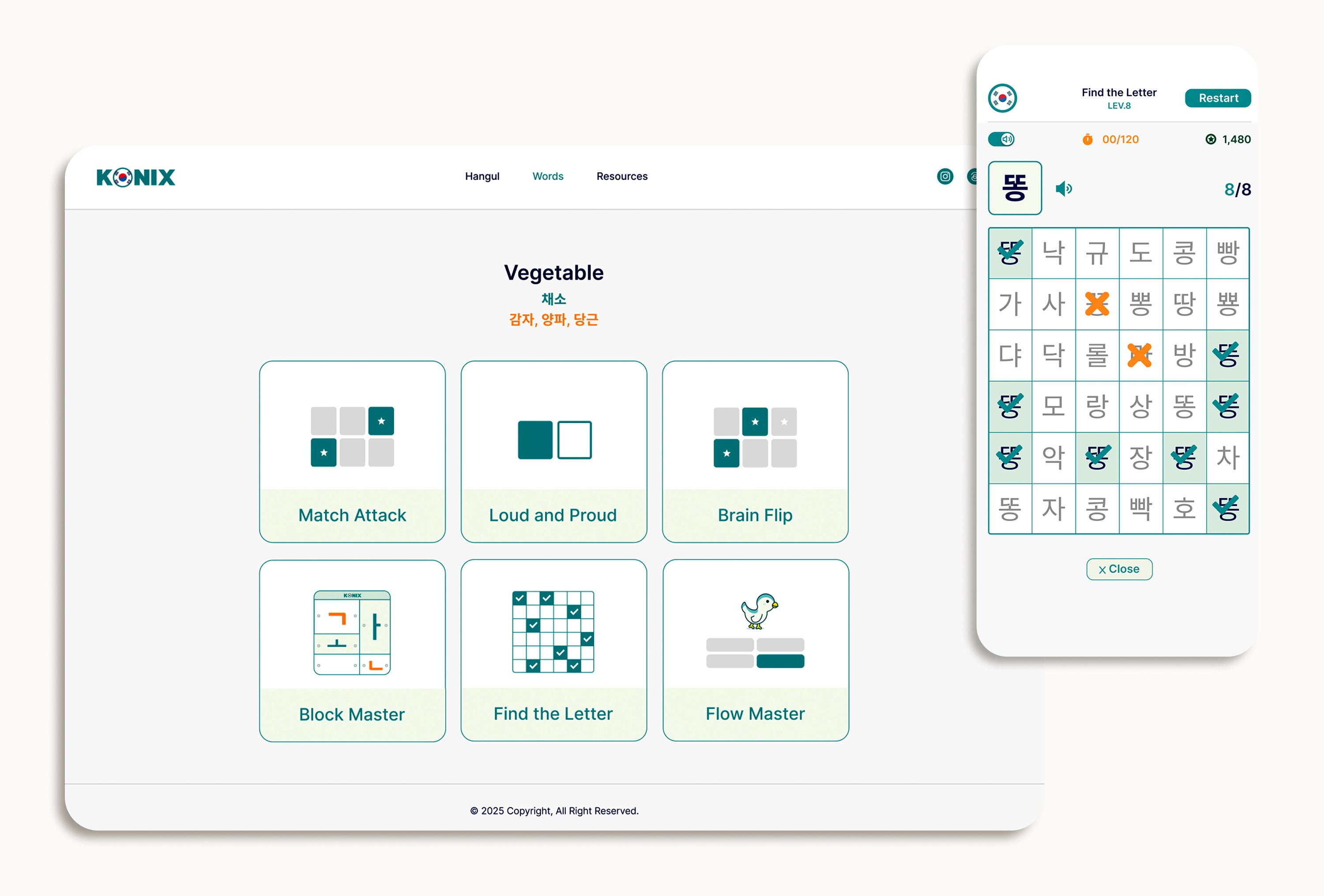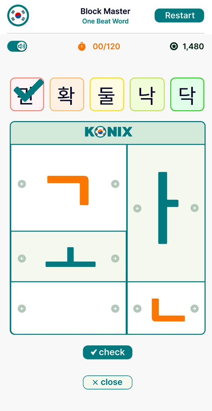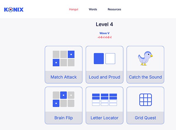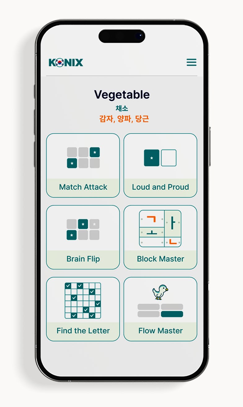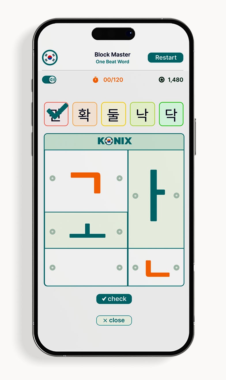 Konix is a gamified learning platform that teaches Hangul's structural logic—40 letters → 11,172 possible syllables. Learn the system once, read Korean forever.